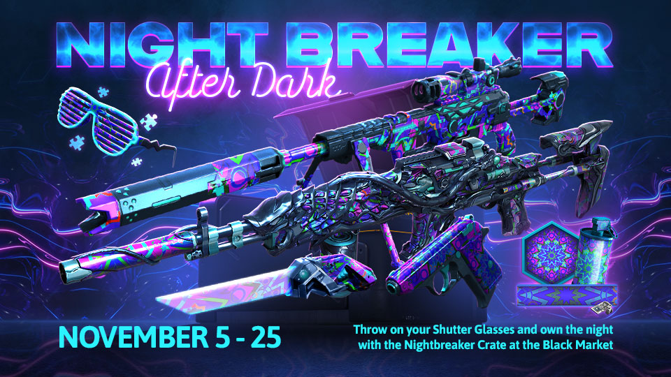 From November 5th until the 25th, head into the Black Market and get the Night Breaker Crate that will be presented in bundles of 5, 10, 30, 50, and 100 EA and will contain the following weapons: