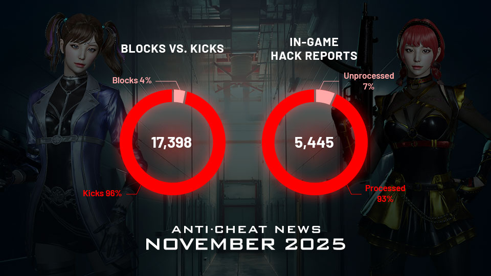 Throughout November, repeated attempts using Wallhacks/ESP cheats were detected, with most being blocked in real-time. Additionally, cheats exploiting vulnerabilities and leaks were detected early, resulting in a significant decrease in overall cheat usage.
