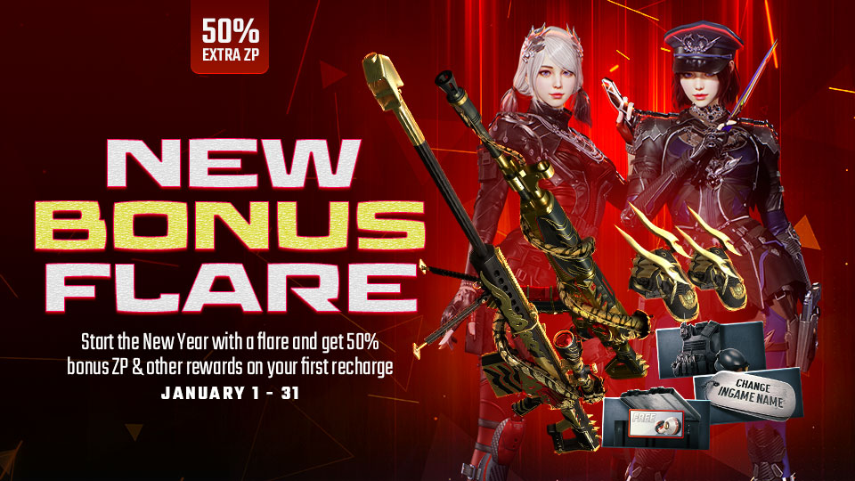 Attention Mercenaries,It’s time to set off those flares because the New Bonus Flare is here! From January 1st through the 31st, earn exciting rewards and 50% bonus ZP on your first recharge this month.