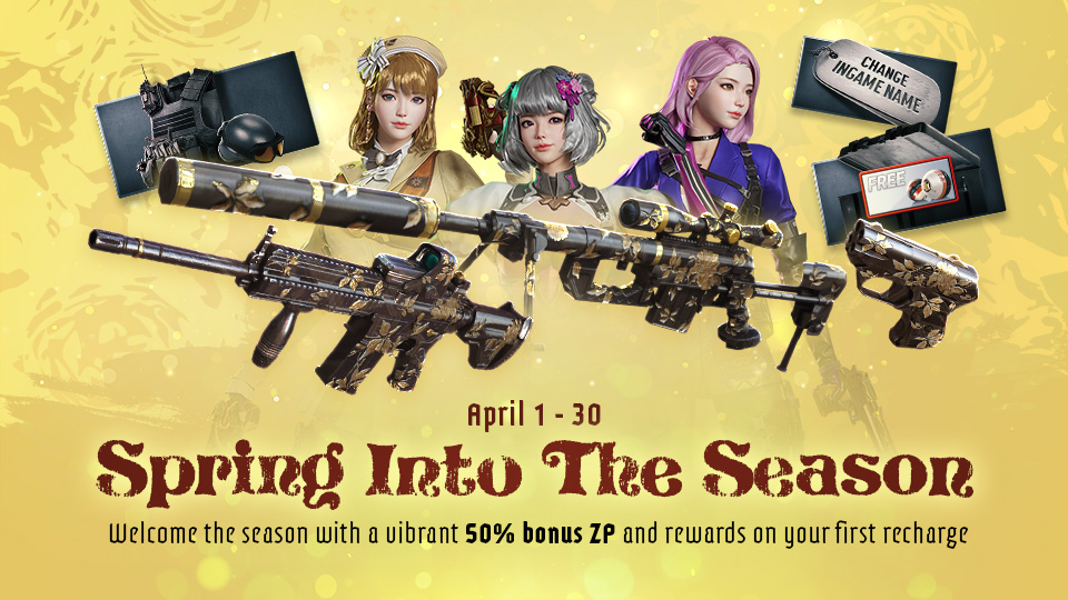 Attention Mercenaries, Fresh days, fresh rewards. Spring Into The Season is here! From April 1st to the 30th, collect exciting springtime rewards and enjoy a 50% bonus ZP on your first recharge this month. 🌷
