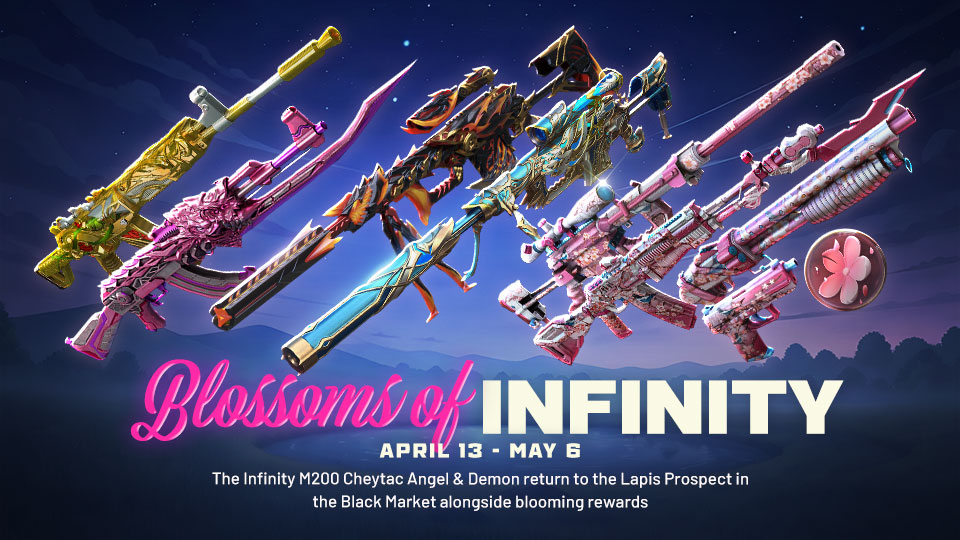Attention Mercenaries, Blossoms of Infinity unfurl across the battlefield from April 13th to May 6th, marking the triumphant return of the Infinity M200 Cheytac Angel and M200 Cheytac Demon to the Lapis Prospect Black Market alongside blooming rewards.