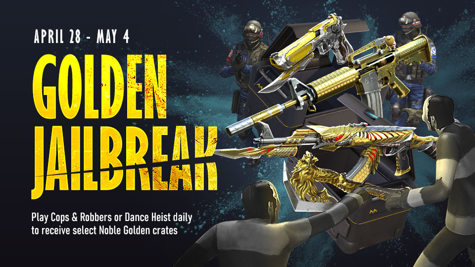 It's time to rob the crates and escape the law! The Golden Jailbreak is your chance to make a clean getaway! From April 28th to May 4th, play Cops & Robbers or Dance Heist daily to earn select Noble Golden Crates. Steal the loot and get away with exclusive rewards. Time to outsmart the law!