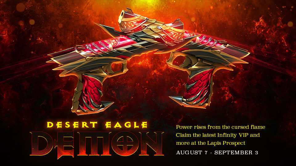 From August 7th to September 3rd, the Infinity VIP Desert-Eagle Demon is summoned to the Lapis Prospect in the Black Market! Gather all of your power and swipe the prize from the jaws of the demon himself, and you will also harness the [NC] Desert Eagle-Demon and the [SP] Desert Eagle-Demon.