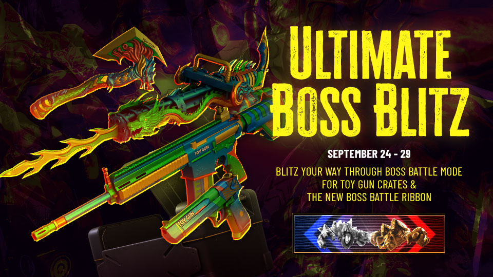 During the battle blitz, play for 20 minutes on Boss Battle Mode to receive 1 Toy Gun Crate (up to 3 times per day). Keep the momentum - complete 20 minutes of Boss Battle Mode on at least 5 event days to earn an extra 10 Toy Gun Crates!