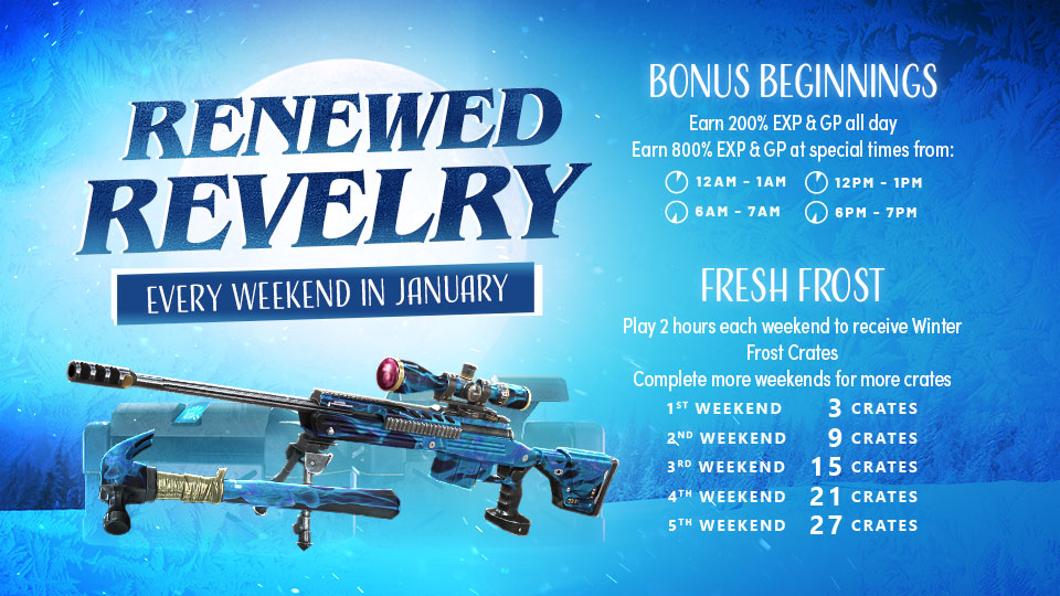 Play 2 hours each weekend to receive Winter Frost Crates! The more weekends you complete your 2 hours, the more crates you get. They multiply!